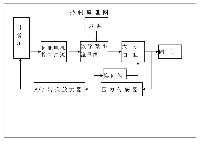 3、自动架载原理:首先让数字微小流量阀打开到一定的开度,使工作缸快速上升,当试块受压产生压力时,试验机通过传感器G将实际压力送入计算机。计算机将实际压力值与理论压力值进行比较,得到一个偏差值,通过PID运算得到一个控制输出量,然后计算机给脉冲发生器发出信号,脉冲发生器产生信号后发送给步进电机驱动器,驱动步进电机转动,步进电机的转动带动数字微小流量阀阀芯的移动,使数字微小流量阀改变节流口的开度,从而达到控制加荷速率的目的。