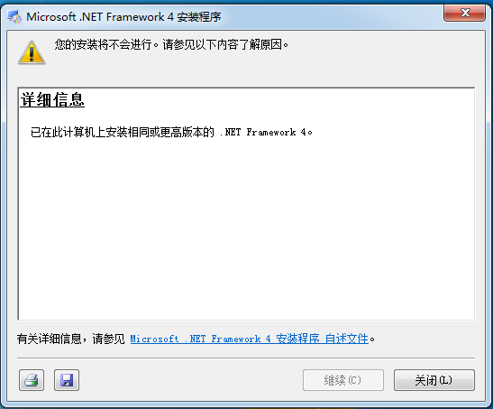提示:如果需要使用软件的自动更新功能的用户需要另外安装目录中的doNetFx40_Full_x86_x64.exe。双击doNetFx40_Full_x86_x64.exe程序开始检测是否已安装,如出现下图提示已安装时点击“关闭”按钮即可。如未安装先勾选“我已阅读并接受许可条款”然后点击“安装”后自动完成安装。