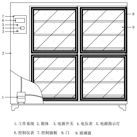 4、加温采用L型电加热管,底部的加热管在水中发热,使箱内温度均匀地提高到设定温度、利用加热产生的气体可作为加湿的辅助补充。